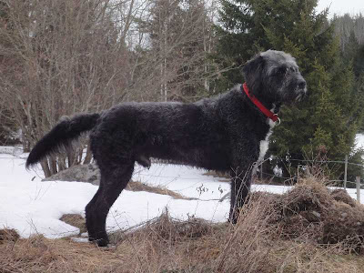 Igår anade jag våren i alla fall.Tätt intill husgrunden vid morbror Åkes äldreboende hade krokusen kommit upp.På hästvägen tittade leran fram på sina ställen.Ibland tittade hela sjöar fram.Det hördes porl och sorl både här och där.Idag tog jag bara med mig matten på långpromisen, för hussen har lite nytt ont i den andra, vänstra, axeln, för nu har den armen gjort en massa ovana saker och blivit trött. Inte kan han tröstäta så mycket heller, för magen är lite orolig. Jag får nog pussa lite extra på honom i kväll... Vårkramar, Ludde!